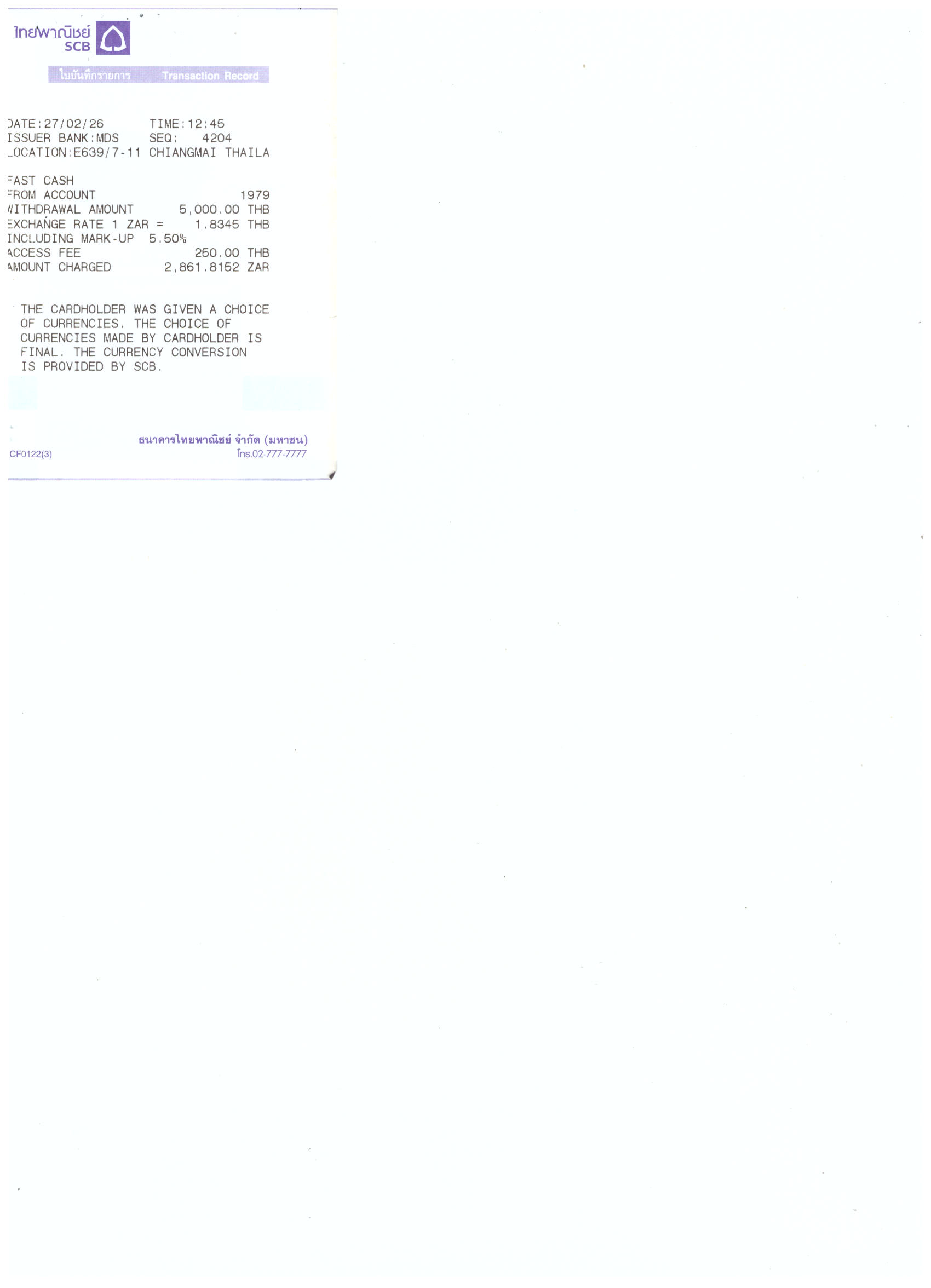 Using a South African bank debit card – one can withdraw money from a Thailand ATM.